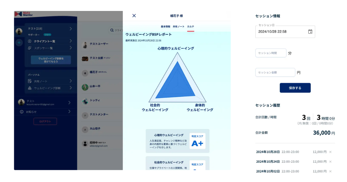 クライアント毎にセッションログを管理できるので、何をテーマとして扱っているのかなどの定性情報や、セッション時間や価格などの定量情報も一目で把握できます。