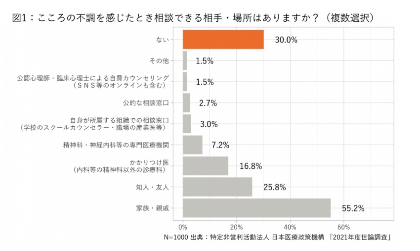 これまで専門職がカバーしきれなかった層への受け皿として、AIが活用されるようになったのも理由のひとつです。日本医療政策機構の世論調査では、こころの不調を感じた際の相談先が「ない」と答えた人が30%も存在することが明らかになっています。